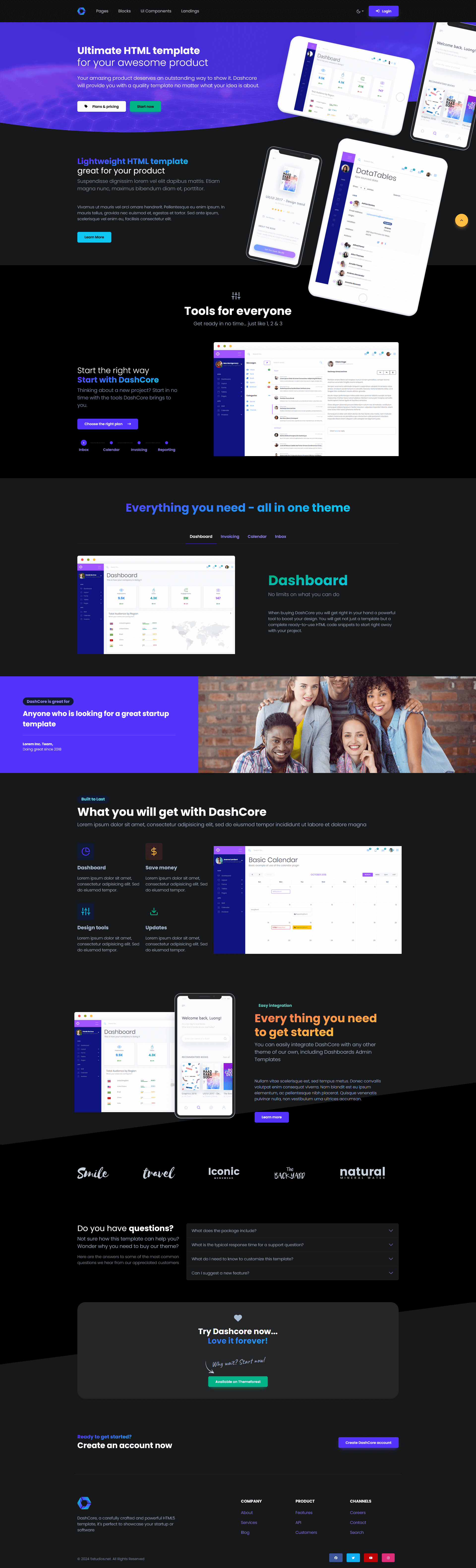 DashCore is an all included HTML template, it's packed with multiple demos and tech stacks to help you get started with your project.